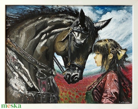 Konstantin Pál: Lány lóval pipacsmezőn modern olajfestmény faroston, fehér fa keretben