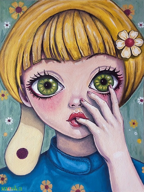 Konstantin Pál: lány modern nagyméretű olajfestmény faroston, zöld keretben