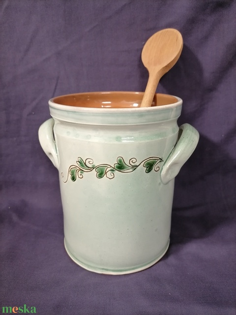 - Anyaga: vörösre égő agyag, színtelen ólommentes máz, fehér engób, zöld máz