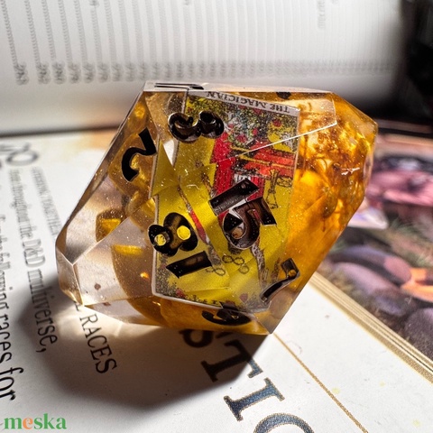 Kristály alakú, a szokásosnál nagyobb d20 kocka, szárított virágokkal és “The Magician” Tarot lappal. ✨