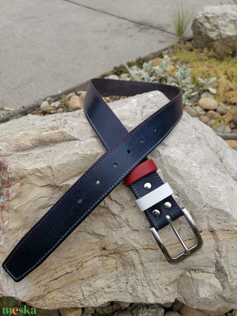Tengerészkék rozsdamentes acél csatos bőr öv, színes varrással.