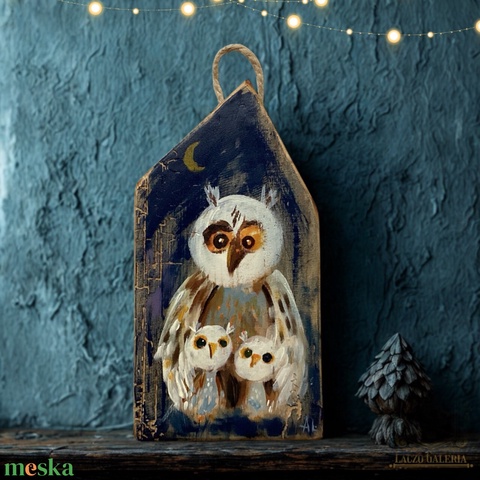 Bagoly mama kicsikkel - Rusztikus Festett Fatábla - Falra akasztható - Ajándék ötlet - Gyerekszoba, Karácsony