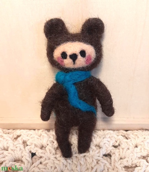 Tűnemez technikával készült stilizált mackó, türkizkék sállal.