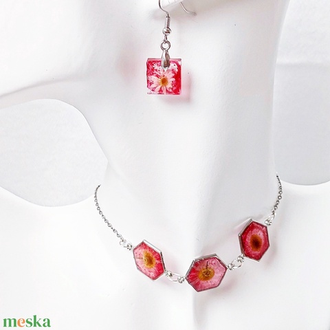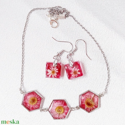 Nemes Piros Százszorszép és Jégvirágos Lila Álom – Hexagon medálos nyaklánc és fülbevaló Ékszer szett