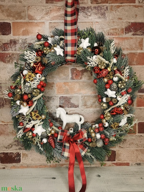 - Anyaga: műfenyő, termések, üvegdíszek, szalag