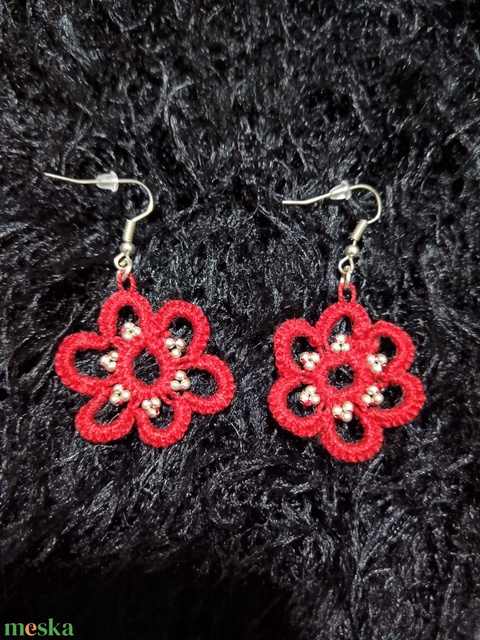 Piros hajócsipke gyöngyös virágos fülbevaló