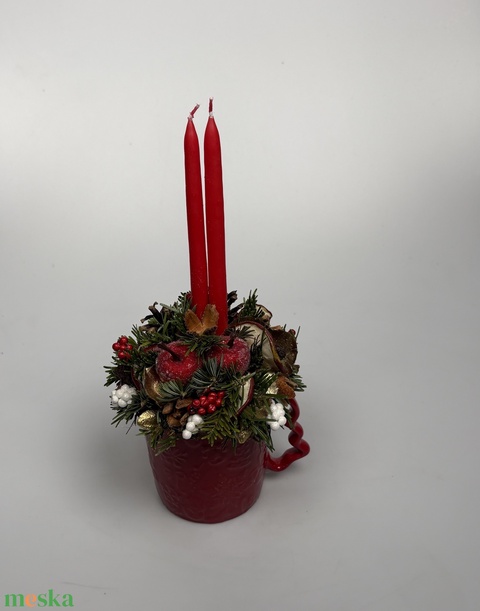 Piros karácsonyi bögrére épült, 2 piros ceruzagyertyával díszített adventi asztaldísz (XM-64)