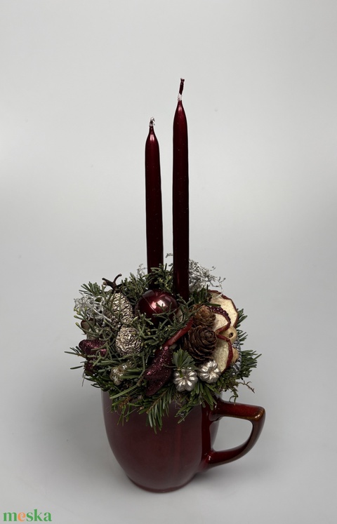 Burgundi vörös színű bögrére épült, 2 bordó ceruzagyertyával díszített adventi asztaldísz (XM-67)