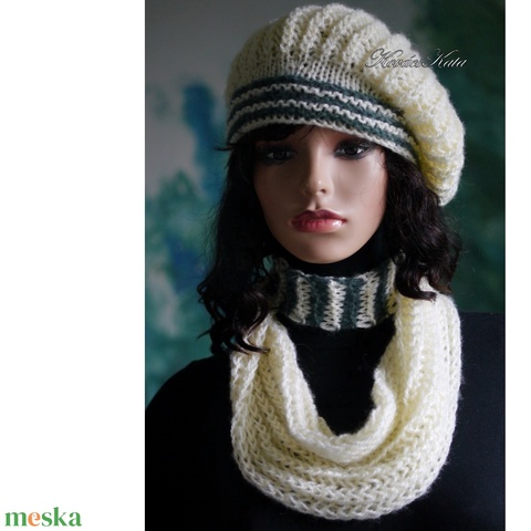 BORBÁLA SZETT / vaj + zöld - exkluzív kézzel kötött gyapjú-moher sapka körsállal