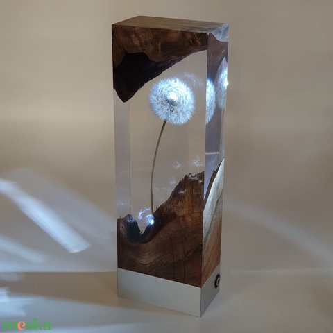 Világító pitypang gyanta dísz, kézműves fénydekor diófa gyökéren, egyedi ajándék természetkedvelőknek