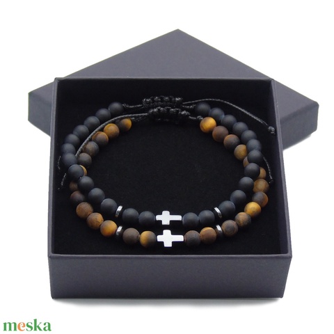 Keresztes matt tigrisszem és matt ónix férfi karkötő díszdobozban