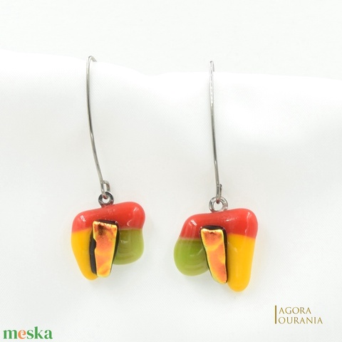- Anyaga: nemes acél fülbevaló akasztó, piros zöld sárga üvegek, arany dichroic ékszerüveg