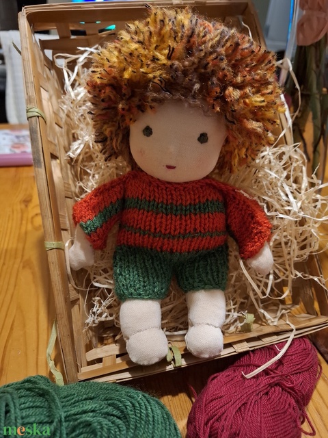 Waldorf baba, amely kézzel készült pamutból, gyapjúból. A babához jár egy gyönyörű mesekönyv is, amelynek a főszereplője a babához hasonlít. 23 cm hosszú.