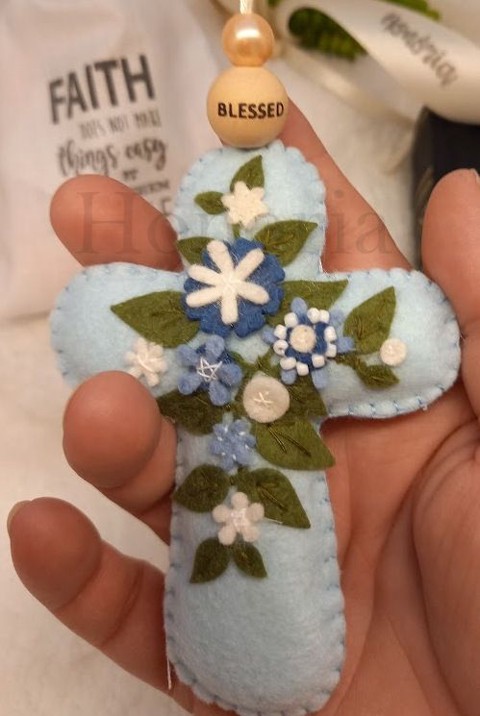 Kereszt, filc virágokkal-Bibliai igés zsákban-BLESSED-kék