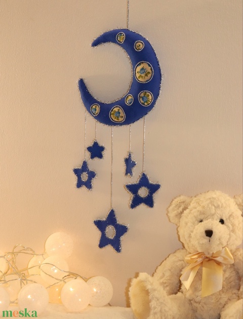 Kék filc hold csillagokkal – kézzel készült, nyugtató gyerekszoba dekor