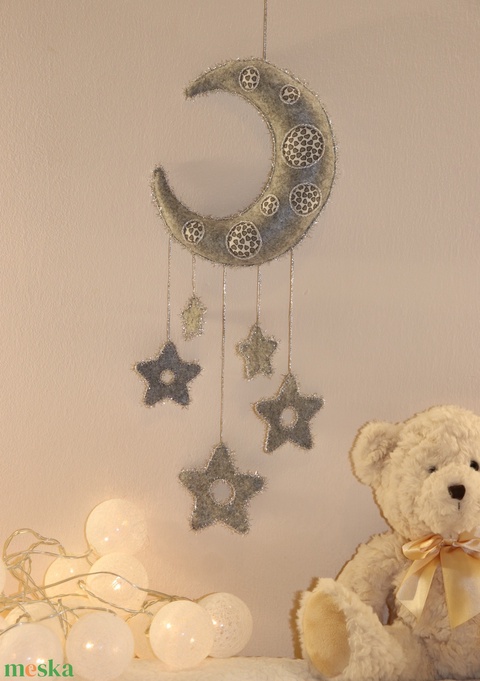 Szürke filc hold csillagokkal – kézzel készült, nyugodt hangulatú dekor