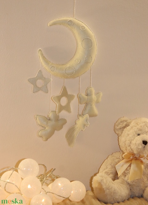 Natúr (vajszínű) filc hold csillagokkal és angyalokkal – kézzel készült falidekor