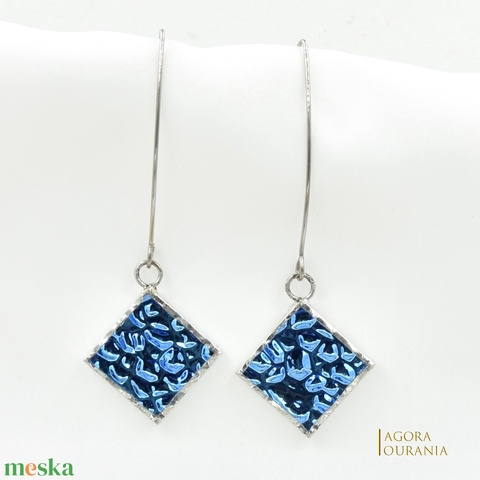 - Anyaga: réz fólia, ezüst tartalmú ólommentes ón, felületkezelő anyagok, kék irizáló dichroic ékszerüveg, nemes acél fülbevaló akasztó