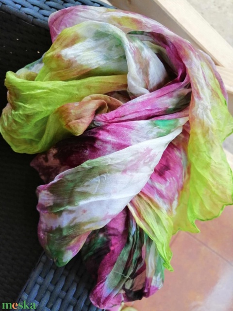Gyűrt,batikolt valódi selyemsál -Olívazöld és bordó árnyalatokkal
