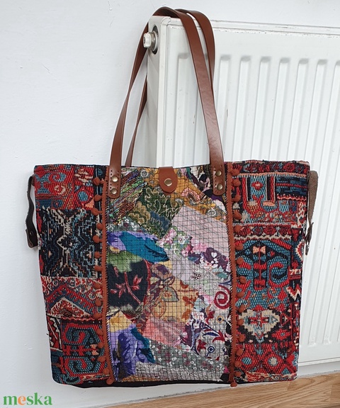 szövött bútorkárpit, patchwork betét, karika, kapocs, merevítő, pamut textil bélés, cippzár, antikolt szegecsek