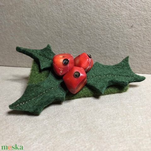Karácsonyi magyalos hajcsat-filcből és korallból