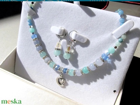 Tenger Szíve Art Deco Nyaklánc és Fülbevaló Szett Akvamarin és Amazonit Kövekkel Ragyogó Ajándékdobozban