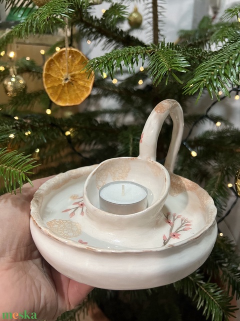 Kézzel készült kerámia mécsestartó – Cseresznyevirág és buborékos díszítés