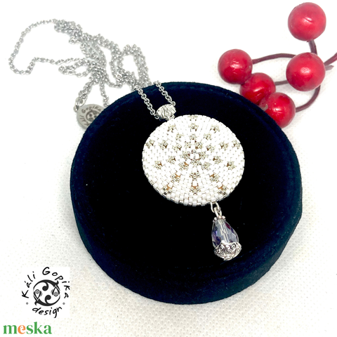 Gyönyörű kétoldalas fehér -ezüst gyöngyfűzött Mandala medál nyaklánc