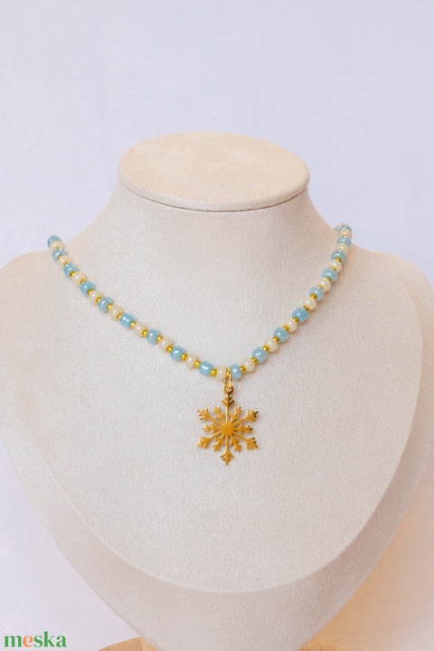 Hópehely medálos nyaklánc - rozsdamentes acél, arany bevonat (18K), kásagyöngy