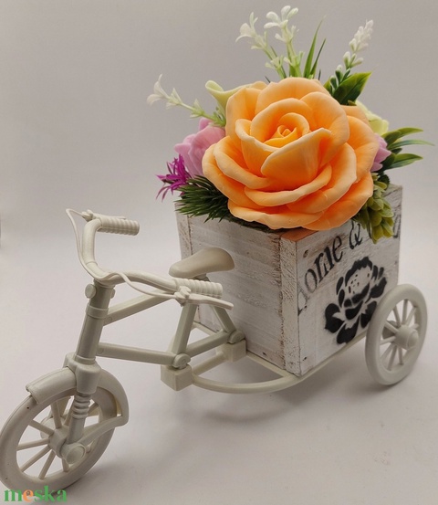 Fehér, műanyag vázas bicikli szappanvirágokkal