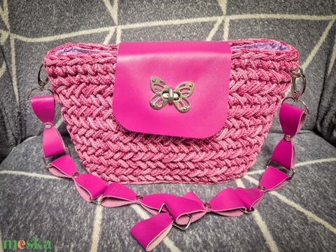 Horgolt válltáska zsinórfonalból, béléssel, bőr szerelékkel