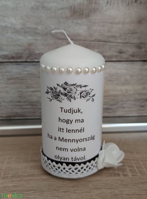 gyertya, átlátszó matrica felirattal, habrózsa, szalag, csipke, gyöngy