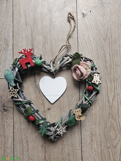 Karácsonyi ajtódísz nemezelt és fa díszítéssel