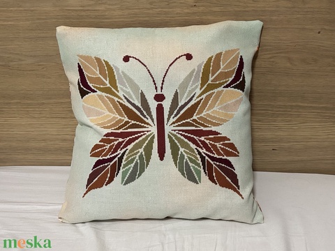 Keresztszemes hímzett pillangós díszpárna – kézműves lakásdekor