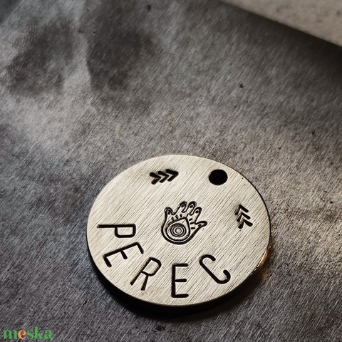 Kézzel kalapált sárgaréz kutyabiléta – "Hamsa Keze" (⌀30mm)