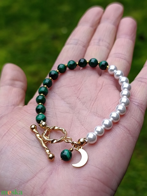 Női teremtő erő, érzelmi védelem és ciklikus egyensúly – malachit és kagylóhéj karkötő Hold medállal