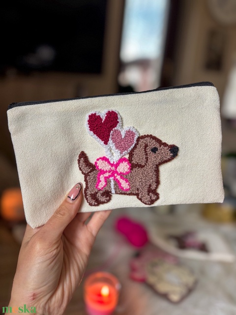 Hímzett tolltartó, rózsaszín masnis tacsi