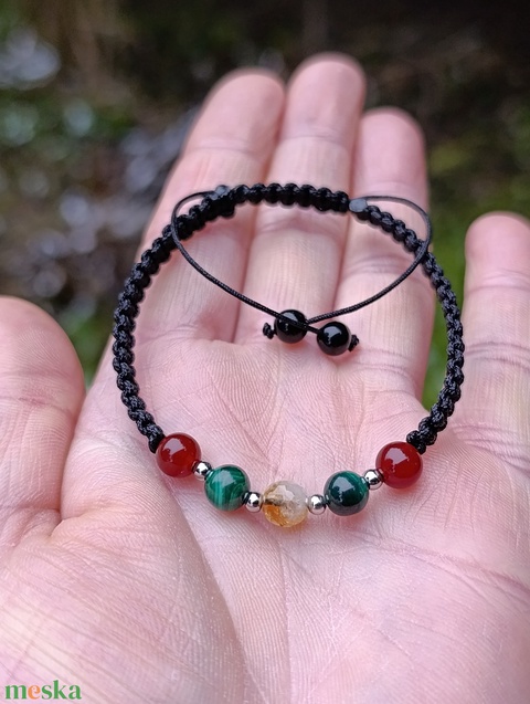 Ez a csomózott karkötő a bőség tudatos megélésének szándékával készült. Nem „szerencsehozó” talizmánként, hanem olyan ásványok kombinációjaként, amelyek segíthetnek felismerni és oldani azokat a belső mintákat, amelyek elválasztanak a bőségtől – legyen szó anyagiakról, lehetőségekről vagy önértékelésről.