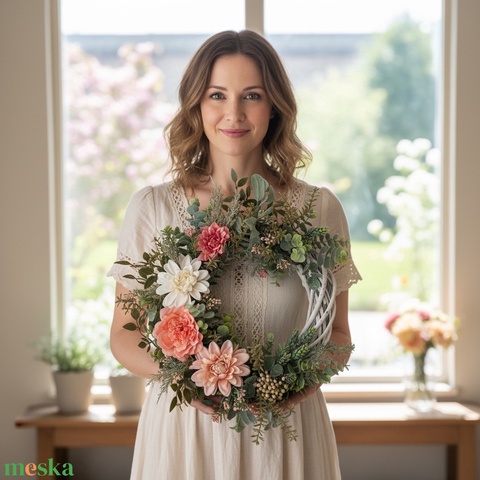 Virágos ajtódísz – természetes hatású, elegáns koszorú pasztell árnyalatokkal