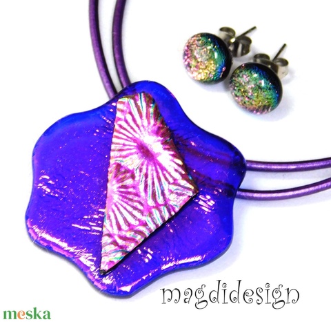 Lila-kék színváltós dichroic üvegékszer szett nyaklánc, stiftes fülbevaló