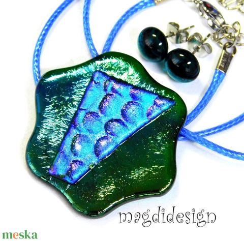 Kék zöld színjáték dichroic üvegékszer szett nyaklánc, stiftes fülbevaló