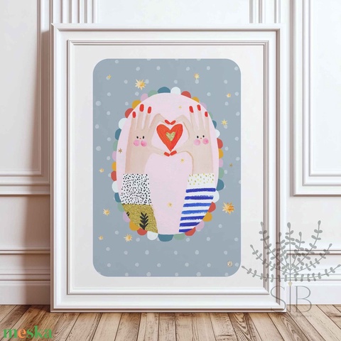 Modern, színes boho stílusú falikép, szívet formázó kezek, barátság ajándék