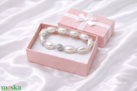 Ez a kézzel készített karkötő a letisztult nőiesség tökéletes megtestesítője. A gyöngyházfényű ovális elemeket aprólékosan kidolgozott, csillogó gyöngysor öleli körbe, míg a díszes, ezüstszínű kapocs diszkrét ragyogást ad az összhatásnak.