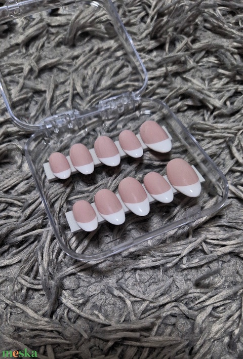 Ez a klasszikus francia stílusú press-on köröm a letisztult elegancia megtestesítője. A természetes hatású nude alap és a finom fehér mosolyvonal időtlen megjelenést ad, amely alkalmas hétköznapokra, ünnepekre vagy akár esküvőre is.
