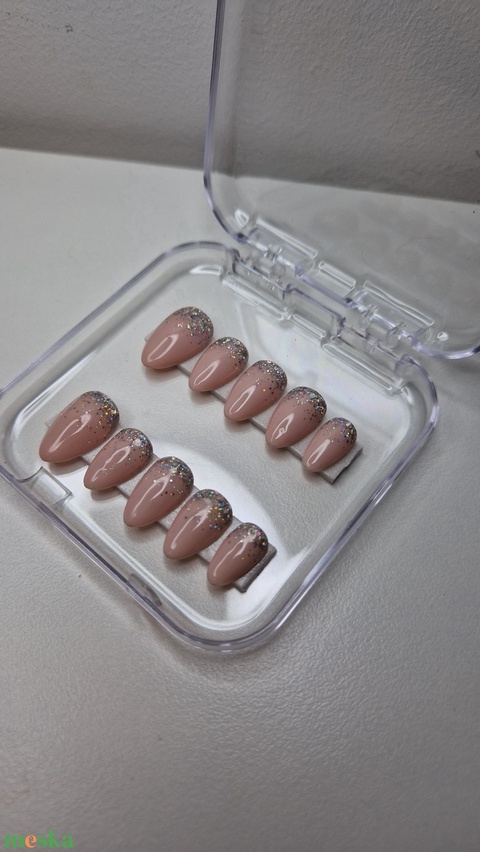 Ez a klasszikus ombre stílusú press-on köröm a letisztult elegancia megtestesítője. A természetes hatású nude alap és a finoman csillogó ombre időtlen megjelenést ad, amely alkalmas hétköznapokra, ünnepekre vagy akár esküvőre is.