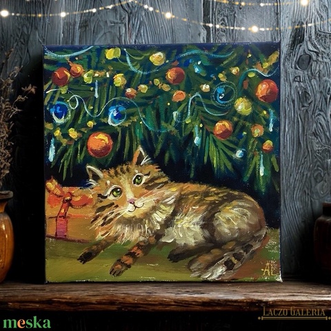 Karácsonyi macska cicó - Eredeti Akril Festmény Vásznon - Laczó Ágnes kortárs festő/grafikus művész - Macska, Cica