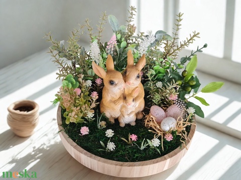 Húsvéti asztaldísz nyuszi családdal – tavaszi dekoráció fa tálban