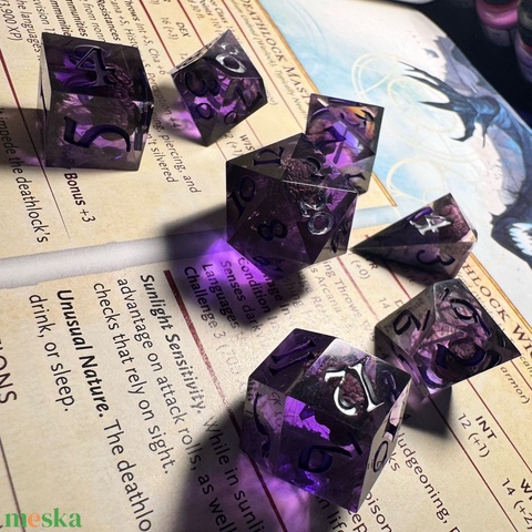 7 darabos készlet, amely szilánk alakú d4-et, illetve rombusz típusú d12 kockát tartalmaz.