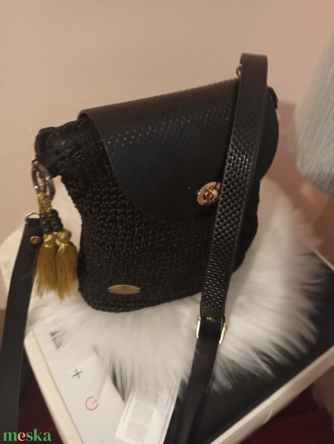 Ez a fekete horgolt táska nemcsak praktikus, hanem igazi karakterdarab. A texturált fedlap, az arany csat és a kézzel készült bojt apró részletei mind azt mesélik: gondossággal, szeretettel készült.