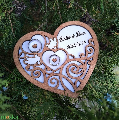 Esküvői gyűrűtartó fa szív – egyedi gravírozással